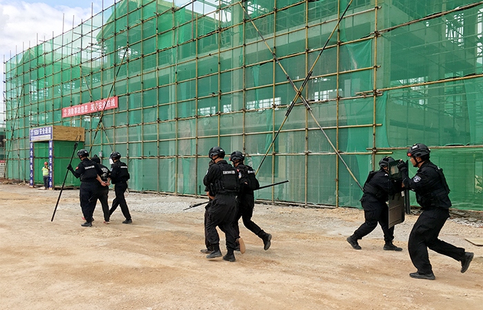 演練現(xiàn)場嚴(yán)格按預(yù)案展開救援,前三個(gè)場景分別是現(xiàn)場工人發(fā)生火災(zāi)、觸電、高處墜落并受傷等施工現(xiàn)場常見的安全事故情況下,由指揮啟動應(yīng)急預(yù)案,現(xiàn)場各應(yīng)急小組嚴(yán)格按照應(yīng)急預(yù)案進(jìn)行處理,配合119消防人員、120急救人員完成搶險(xiǎn)消除事故、妥善處置傷員。最后一項(xiàng)反恐應(yīng)急演練,其場景是在當(dāng)前反恐形勢日益嚴(yán)峻的形勢下,3名暴恐分子偽裝成農(nóng)民工隱藏在施工工地妄想伺機(jī)作案,由于不配合項(xiàng)目部員工進(jìn)行農(nóng)民工實(shí)名制登記而暴露身份,3名暴恐分子拔出攜帶的道具砍向項(xiàng)目部員工,項(xiàng)目部員工立即與其展開周旋并掩護(hù)一名員工向指揮匯報(bào)情況,請求救援。因3名暴恐分子攜帶刀具砍傷人員,接到報(bào)告后現(xiàn)場立即啟動反恐預(yù)案,各小組展開救援,保衛(wèi)組持長棍對暴恐分子圍堵并保持距離,醫(yī)療組對受傷人員即刻開展緊急救治,通訊組立刻撥打110請求警務(wù)人員支援,撥打120請求急救中心急救傷員。警務(wù)人員到來后制服兇徒,傷員得到120人員急救處理,現(xiàn)場隱患得到消除。