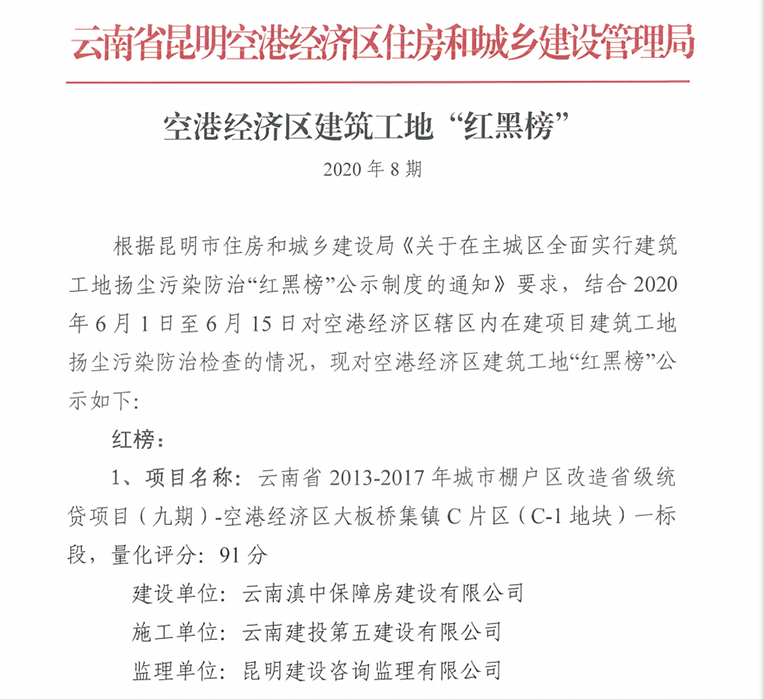 技術(shù)支持: 方森科技6月15日,昆明空港經(jīng)濟(jì)區(qū)住房和城鄉(xiāng)建設(shè)管理局公示了“空港經(jīng)濟(jì)區(qū)建筑工地‘紅黑榜’”,五〇一直管項目部施工的空港項目以量化評分91分的成績榮登“紅榜”。