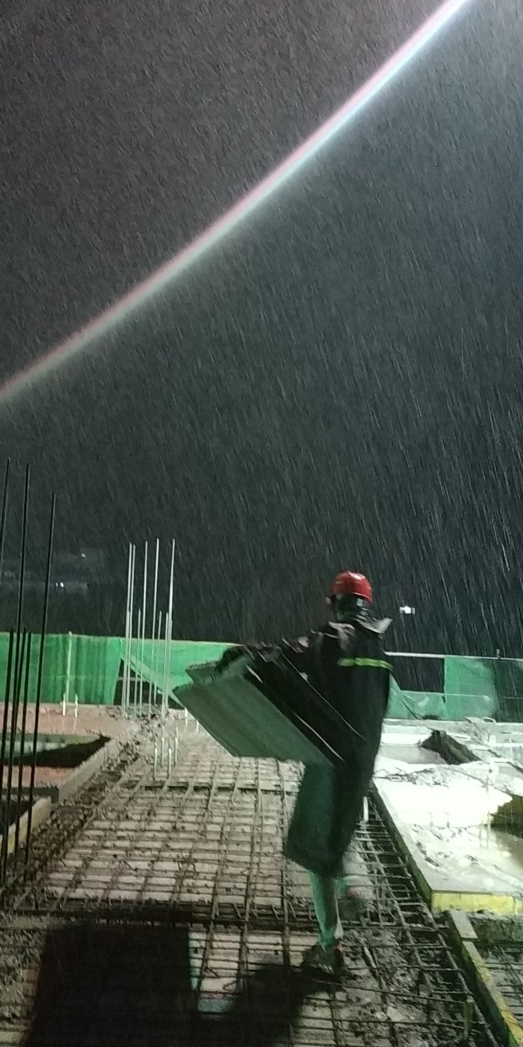 11月7日鎮(zhèn)雄縣第二人民醫(yī)院項(xiàng)目迎來了2018年的第一場雪,這是一個雷電、雨、雪交加的晚上,給人的感覺身處在一個偌大的冰窖里,我窩在被窩里抱著火爐看電視。然而在如此寒冷上廁所都需要勇氣的夜晚,為了確保完成11月30日節(jié)點(diǎn)目標(biāo),我們的項(xiàng)目副經(jīng)理成俊、施工員胡杰盛和民工兄弟們,冒著雷雨雪依然堅(jiān)守在澆筑混凝土的第一線。在寒冷的冬季,如何保證澆筑的混凝土質(zhì)量是一大難題,在質(zhì)量總監(jiān)劉榮軍的指導(dǎo)下對混凝土成品采取防凍防寒措施,第一層采用薄膜覆蓋、第二層用土工布鋪蓋、第三層用防水黑棉鋪蓋、第四層用土工布覆蓋壓實(shí),澆筑完后用兩盞三千瓦燈對射覆蓋。