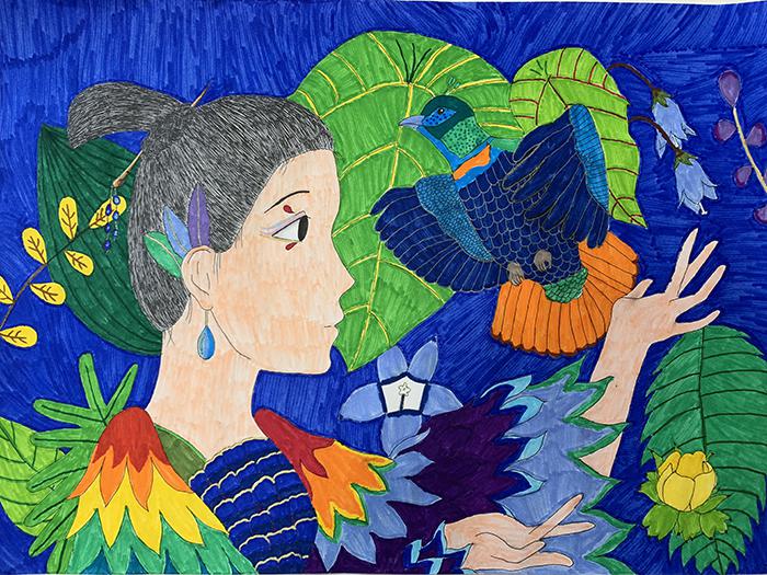 畫(huà)中描繪了色彩絢麗的棕尾虹雉,頭部為綠色,藍(lán)綠色羽冠,上體紫藍(lán)綠色,羽干細(xì)而裸出,羽端呈匙狀,如同絲絨一般,全身羽毛都閃耀著彩虹一樣的金屬光澤,又叫“彩虹鳥(niǎo)”和“九色鳥(niǎo)”。將絢麗多彩的“彩虹鳥(niǎo)”在心中、畫(huà)中擬人化,展開(kāi)豐富的想象,以人物的形象將鳥(niǎo)擬人成人物,又將美麗的少女形象地比擬成“彩虹鳥(niǎo)”。她們低聲細(xì)語(yǔ),輕聲呢喃。將心中對(duì)生命的愛(ài),對(duì)動(dòng)物、植物、綠色、美麗的家園、美好的愿景展示出來(lái)。反映了人與動(dòng)物,人與自然,和諧共生,和諧共處,你中有我,我中有你,你就是我,我就是你。形成一幅絢麗多彩的畫(huà)面。展現(xiàn)出小作者對(duì)美好事物的憧憬,內(nèi)心的純凈與美好,體會(huì)到小作者內(nèi)心的溫暖與美好。