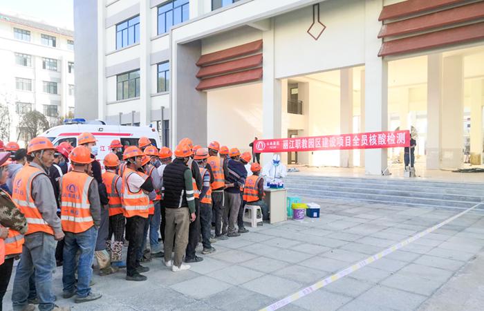 在此過程中,麗江職教園區(qū)項目部積極組織管理人員、在場施工工人和項目部后勤人員共251人進行核酸采集,工人們井然有序地排隊配合醫(yī)護人員進行核酸采集。