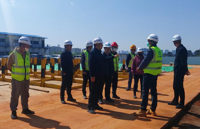 付雋蒼一行深入項(xiàng)目施工現(xiàn)場實(shí)地調(diào)研,了解項(xiàng)目施工動(dòng)態(tài),聽取了直管部負(fù)責(zé)人及項(xiàng)目經(jīng)理對項(xiàng)目整體建設(shè)、生產(chǎn)進(jìn)度、安全、質(zhì)量管控等情況的詳細(xì)匯報(bào),實(shí)地考察了項(xiàng)目推進(jìn)情況。