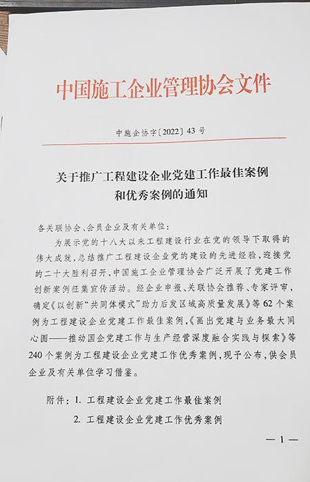 近日,中國施工企業(yè)管理協會開展了黨建工作創(chuàng)新案例征集宣傳活動,經過專家評審,公司申報的《以“12345”黨建工作思路引領高質量發(fā)展》入選“工程建設企業(yè)黨建工作優(yōu)秀案例”。