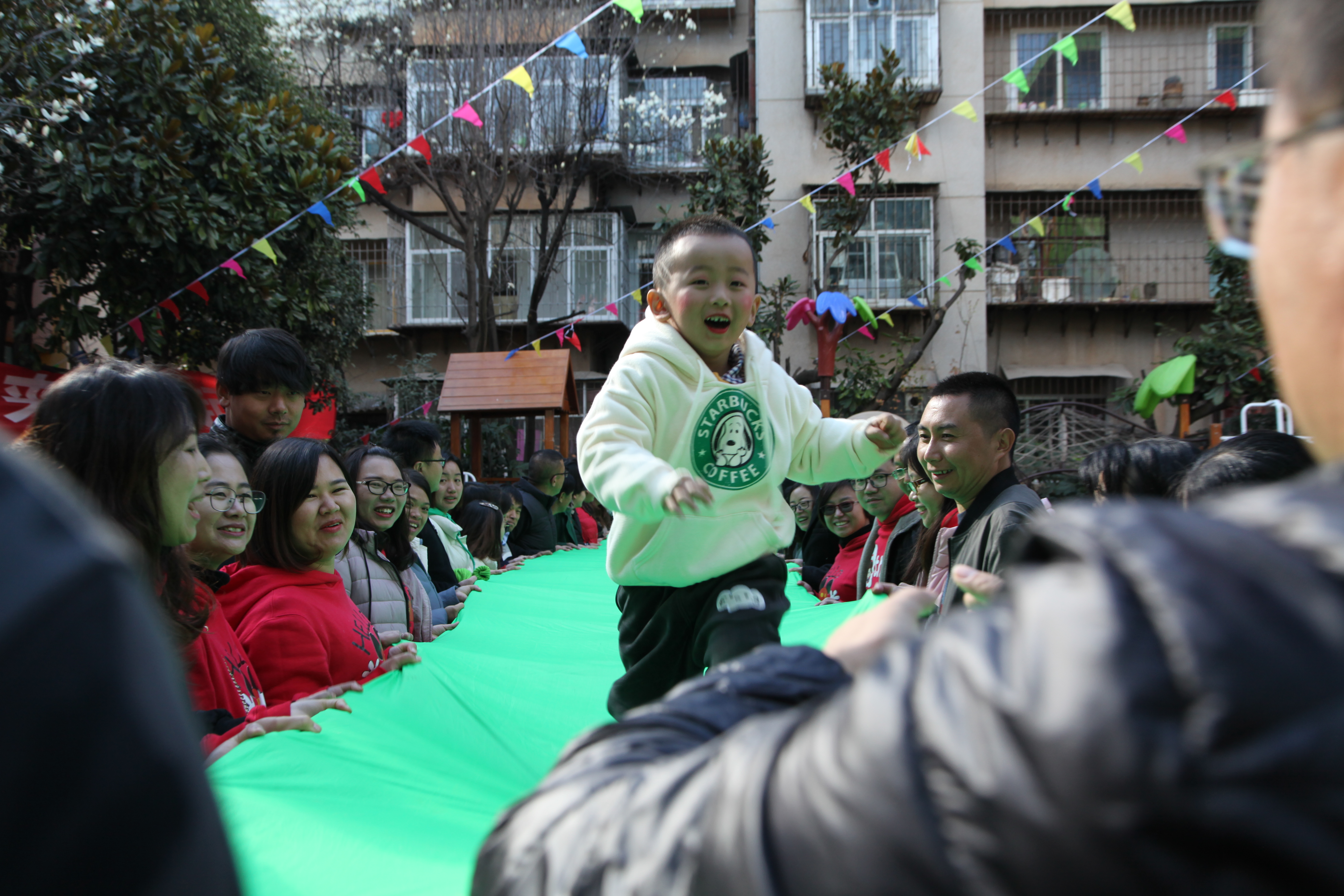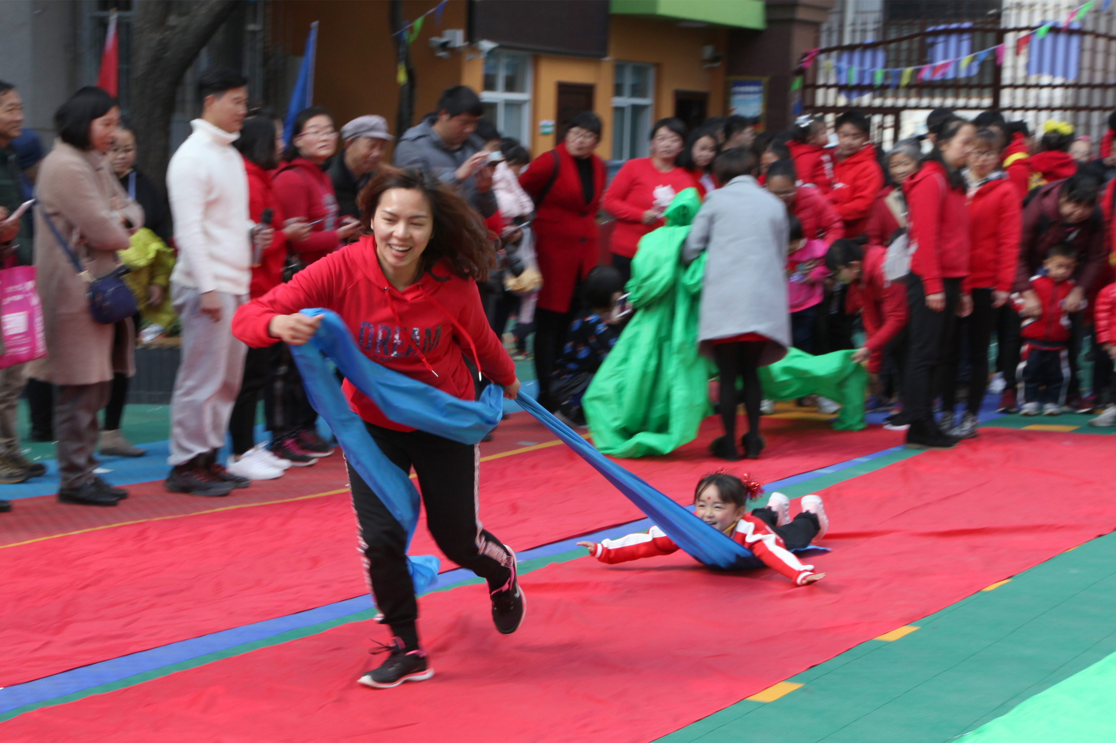 運動會從熱身操開始,小班的小朋友在家長的陪伴下跳起了親子操,中班的小朋友舞動著彩圈帶給大家一段活潑可愛的運動操,大班的小朋友拍著籃球進場展示了酷炫的籃球操。舒活了筋骨,舞蹈班的小朋友們給大家?guī)砹烁魇礁鳂拥闹黝}舞蹈,場下的小朋友看到自己的小伙伴上場,便喊著“加油”“加油”為他們應(yīng)援。待群體舞蹈展示結(jié)束,小朋友們在老師的帶領(lǐng)下與家長開展了體育游戲。小班的家長們齊拉綢布,為孩子搭起了“成長橋”,小朋友們從“成長橋”上走過,有的快步奔跑,有的小步慢走,有的孩子在“橋上”跌倒又在家長的鼓勵下繼續(xù)前進奔向老師的懷抱。場地另一邊,大班的孩子們以班級為小組展開了激烈的投籃比賽。場地的開闊區(qū)域,老師用綢布搭起跑道,家長一個一個拉著趴在綢布上的孩子體驗“超人快飛”游戲,孩子們張開雙臂、抬起小腳,感受著父母帶給自己的“超能力”。
