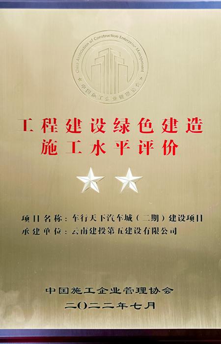 近日,中國施工企業(yè)管理協(xié)會發(fā)布了2022年“工程建設(shè)綠色建造施工水平評價(jià)”結(jié)果,公司車行天下汽車城(二期)建設(shè)項(xiàng)目獲二星評價(jià)。