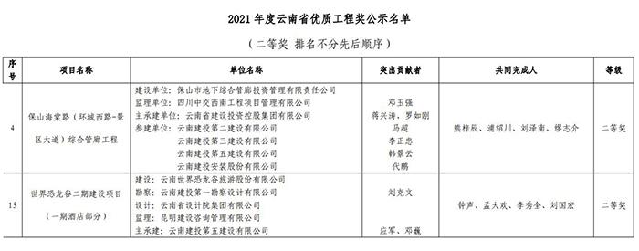 近日,云南省建筑業(yè)協(xié)會公布了2021年度云南省優(yōu)質(zhì)工程獲獎名單,公司承建的保山海棠路(環(huán)城西路-景區(qū)大道)綜合管廊工程、世界恐龍谷二期建設項目(一期酒店部分)2個項目榮獲二等獎。