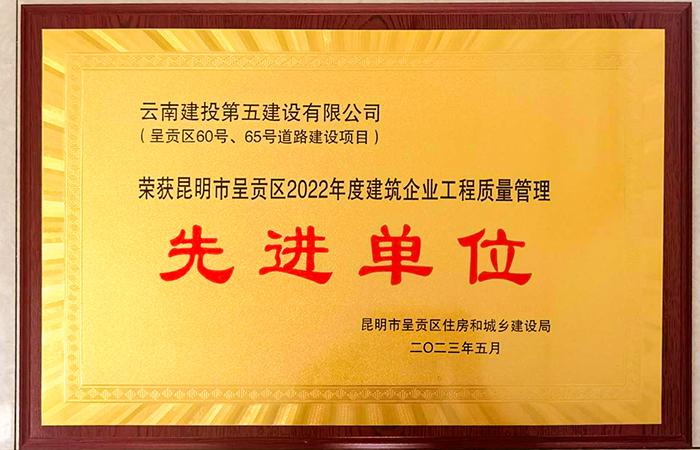 近日,由第二直管項目部負責施工的呈貢區(qū)60號、65號道路建設項目榮獲呈貢區(qū)住房和城鄉(xiāng)建設局授予的昆明市呈貢區(qū)2022年度建筑企業(yè)工程質量管理“先進單位”榮譽稱號。
