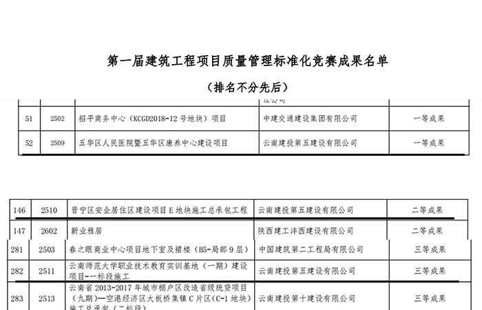 近日,中國建筑業(yè)協(xié)會質(zhì)量管理與監(jiān)督檢測分會公布了第一屆建筑工程項目質(zhì)量管理標準化競賽的成果名單。公司參評的五華區(qū)人民醫(yī)院暨五華區(qū)康養(yǎng)中心建設(shè)項目獲一等成果、晉寧區(qū)安企居住區(qū)建設(shè)項目E地塊施工總承包工程獲二等成果,云南師范大學職業(yè)技術(shù)教育實訓基地(一期)建設(shè)項目-一標段施工獲三等成果。