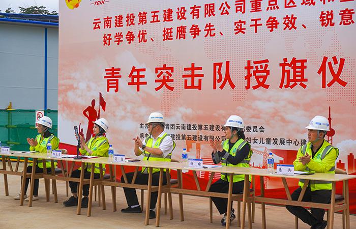 9月27日上午,公司在云南婦女兒童發(fā)展中心建設(shè)項(xiàng)目舉行重點(diǎn)區(qū)域和重點(diǎn)項(xiàng)目“好學(xué)爭(zhēng)優(yōu)、挺膺爭(zhēng)先、實(shí)干爭(zhēng)效、銳意爭(zhēng)新”青年突擊隊(duì)授旗儀式,集團(tuán)團(tuán)委書(shū)記、本部工會(huì)主席楊瑜,公司黨委書(shū)記、副董事長(zhǎng)蔣璽出席授旗儀式并講話。