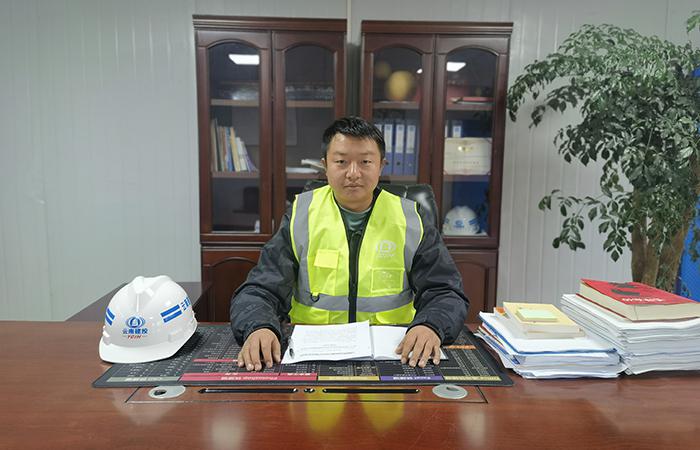 我們乘坐的車輛從學(xué)校東門駛?cè)耄盍譂膳c崗?fù)け0矒]手致意,對方立刻放行,想來彼此已經(jīng)非常熟絡(luò)。來到項目部門口,我立刻被這潔凈美觀的小院所吸引:地面一塵不染,車輛停放整齊;花壇里的粉色月季競相綻放,環(huán)繞項目部的草地生氣勃勃,顯出與初冬季節(jié)相悖的濃濃翠意;L形的兩棟二層活動板房上分別張貼著“傳承發(fā)揚敬業(yè)、專注、精益、創(chuàng)新的工匠精神,執(zhí)著于打造精品工程和提供優(yōu)質(zhì)服務(wù)”“只有干好今天的現(xiàn)場,才能贏得明天的市場”標(biāo)語,小院靜謐而溫馨。