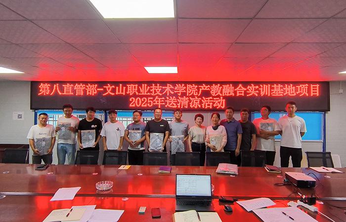7月18日,第八直管部工會到文山職業(yè)技術(shù)學(xué)院產(chǎn)教融合實(shí)訓(xùn)基地項(xiàng)目開展2025年送清涼活動,為堅(jiān)守一線職工發(fā)放了防曬服,送上直管部工會最真摯的關(guān)懷。