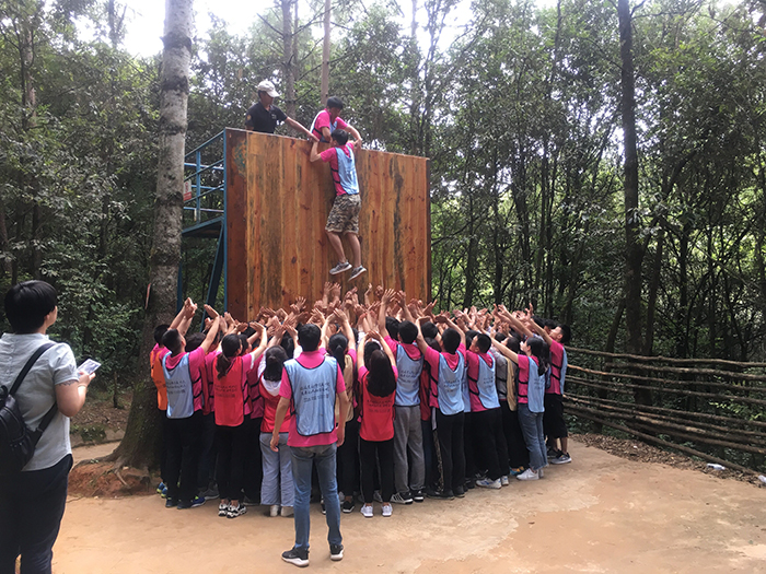 新員工們被分成了四支隊伍,通過七米高空作業(yè)、呼啦圈傳遞、運球接力、九人十腳、團(tuán)結(jié)墻項目等不同的項目訓(xùn)練,體會到了凝聚力對一個團(tuán)隊的重要意義。