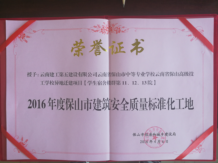 技術支持: 方森科技 4月5日,由第四直管項目部施工的保山中等專業(yè)學校(保山高級技工學校)異地遷建項目(學生宿舍樓群第11、12、13院)被保山市住房和城鄉(xiāng)建設局評為“2016年度保山市建筑安全質量標準化工地”。