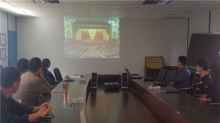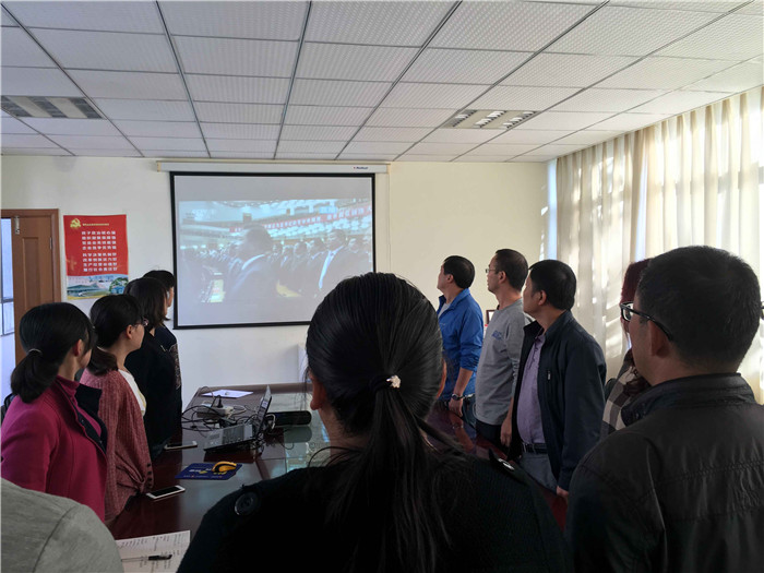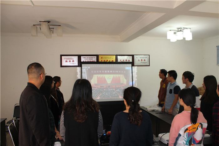 在習(xí)近平總書記提議:“全體起立,為在長征途中和在各地革命斗爭中英勇犧牲的革命烈士默哀!”時觀看直播的黨員及職工起立默哀。