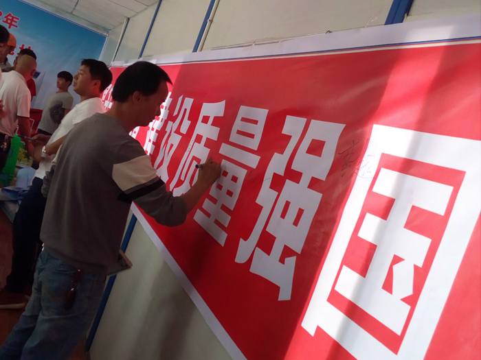 昭通市昭陽區(qū)2013年保障性住房建設(shè)項目2-B地塊標(biāo)段經(jīng)理在會上作動員講話,施工勞務(wù)班組代表在會上進行宣誓,活動最后全體參會人員在布標(biāo)上簽字承諾。