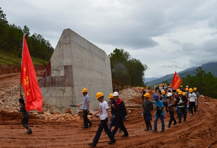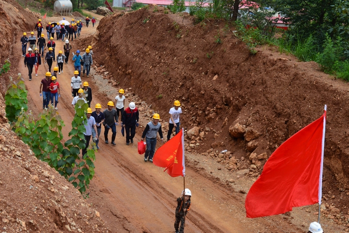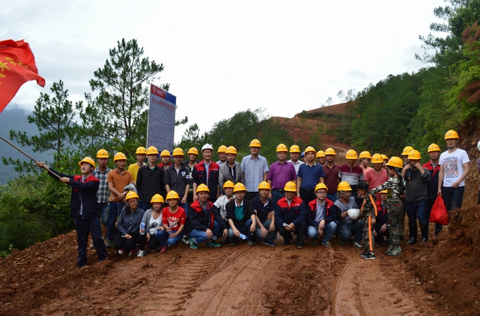 徒步隊(duì)伍中還有兩個(gè)放假來到工地探望父母的小旗手,其中大一點(diǎn)的小旗手扛著項(xiàng)目部的青年突擊隊(duì)隊(duì)旗走完全程,小一點(diǎn)的在父母及項(xiàng)目部叔叔的幫助下也走完了全程。徒步隊(duì)伍走到半路時(shí),還與前來項(xiàng)目調(diào)研的公司領(lǐng)導(dǎo)不期而遇,大家一起在貫通的便道中途合了影,為整個(gè)行程留下了美好的回憶。