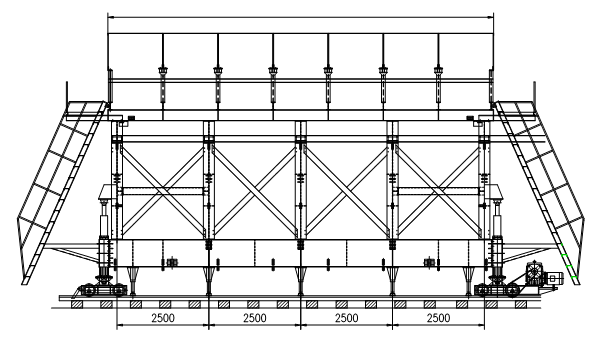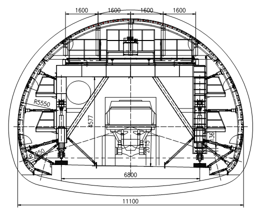 二襯臺(tái)車主要由模板總成、頂模架體、平移機(jī)構(gòu)總成、門(mén)架總成、主從行走機(jī)構(gòu)、絲杠千斤頂、液壓系統(tǒng)、電氣系統(tǒng)等組成。臺(tái)架采用裝載機(jī)和挖掘機(jī)配合安裝,模板安裝時(shí),主要使用挖掘機(jī)配合人工進(jìn)行安裝。二襯臺(tái)車用于對(duì)隧道內(nèi)壁的二襯砼襯砌施工,也是隧道施工過(guò)程二次襯砌中必須使用的專用設(shè)備。當(dāng)隧道掌子面(左右洞)施工達(dá)到80米后,在洞口處拼裝二襯臺(tái)車。