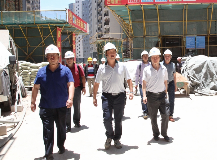 在現(xiàn)場,施文鐘圍繞“五位一體”重點檢查了進度較快的14棟,以及進度較為緩慢的12棟的施工情況,并對施工進度及勞動力的組織情況進行了詳細的了解,對現(xiàn)場可以抓緊時間盡快完成的分項工程向項目管理人員進行了交代,提出要求。