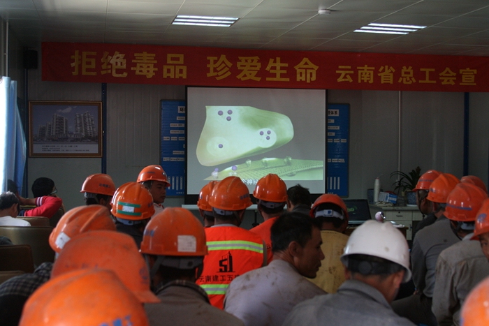 根據(jù)省委宣傳部、省禁毒委關(guān)于《云南省禁毒人民戰(zhàn)爭實施方案》和中華全國總工會與國家禁毒委員會辦公室在全國廣大職工中開展以“抵制毒品、參與禁毒”為主題的拒絕毒品“零計劃”宣傳教育活動的有關(guān)要求,為增強職工禁毒意識,提高了大家識毒、拒毒、防毒的能力,公司工會組織禁毒宣傳小組來到昆明市官渡區(qū)五里中央商務(wù)區(qū)回遷安置房項目部,向現(xiàn)場包括六公司和十公司在內(nèi)的職工及勞務(wù)工人180余人進行了禁毒知識宣傳活動?;顒由?,禁毒宣傳小組不僅給大家進行禁毒知識的宣傳,還免費為現(xiàn)場職工進行心臟、脈搏、血壓等常規(guī)體檢,為冬季防流感提供咨詢平臺,宣傳高血壓、高血脂、糖尿病等常見慢性疾病的預(yù)防保健知識,發(fā)放了板藍(lán)根沖劑、抗病毒顆粒、風(fēng)寒風(fēng)熱感冒沖劑和小柴胡等防治流感藥品100多盒,還發(fā)放了創(chuàng)可貼、醫(yī)用酒精、棉球等日常外用藥品和200盒安全套。