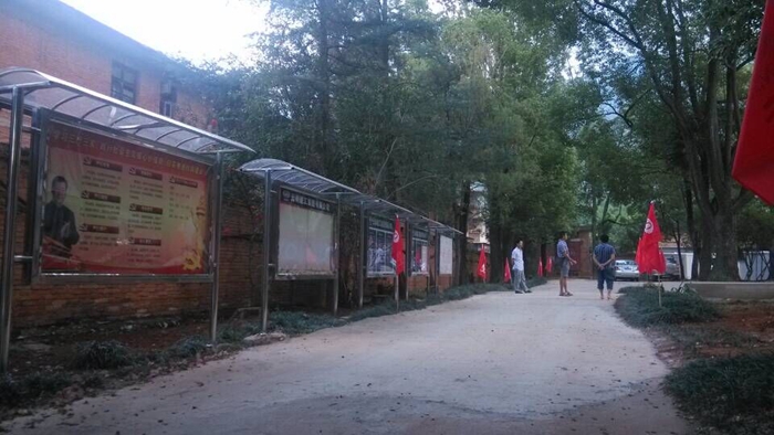 駐地辦公區(qū)印有“云南建工”標識的小紅旗、安全標語及宣傳欄