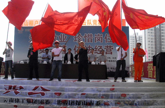 技術(shù)支持: 方森科技    9月15日上午,保山棚改項(xiàng)目舉行青年突擊隊(duì)授旗儀式,團(tuán)省委副書(shū)記趙國(guó)良宣布保山市青華湖片區(qū)紅花二期建設(shè)項(xiàng)目青年突擊隊(duì)競(jìng)賽正式啟動(dòng)。共青團(tuán)保山市委副書(shū)記楊博,集團(tuán)直屬總承包二部黨總支書(shū)記兼副總經(jīng)理周炳軍,集團(tuán)團(tuán)委副書(shū)記楊瑜出席啟動(dòng)儀式。