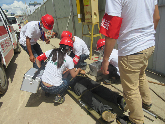 在模擬演練過(guò)程中:現(xiàn)場(chǎng)管理人員發(fā)現(xiàn)施工現(xiàn)場(chǎng)2個(gè)地點(diǎn)出現(xiàn)“火災(zāi)事故”后,立即向現(xiàn)場(chǎng)安全總監(jiān)報(bào)告,安全總監(jiān)第一時(shí)間向直管部經(jīng)理吳志鑫匯報(bào),針對(duì)發(fā)生火勢(shì)情況立即宣布啟動(dòng)項(xiàng)目部消防應(yīng)急救援預(yù)案,項(xiàng)目負(fù)責(zé)人楊欽隨即帶領(lǐng)各消防應(yīng)急小組趕赴現(xiàn)場(chǎng)參與救援,并撥打110、120、119請(qǐng)求支援。接到“報(bào)警”后,澄江縣公安消防大隊(duì)、澄江縣急救站、澄江縣龍街派出所人員第一時(shí)間趕到現(xiàn)場(chǎng),消防官兵及時(shí)用高壓水槍撲滅負(fù)一層樓板頂面火勢(shì)后,沖到樓板頂面救援,疏散被困人員,現(xiàn)場(chǎng)搜救受傷人員,并及時(shí)撤離現(xiàn)場(chǎng),用擔(dān)架把“受傷”人員抬下送至救護(hù)車。到場(chǎng)的急救中心人員做好救援準(zhǔn)備,對(duì)“傷員”做了簡(jiǎn)單的應(yīng)急處理,立刻“轉(zhuǎn)送”醫(yī)院救治;派出所民警則有條不紊地在現(xiàn)場(chǎng)維持秩序,配合消防官兵救援。與此同時(shí),項(xiàng)目部消防應(yīng)急小組搶險(xiǎn)組也用干粉滅火器對(duì)負(fù)二層樓梯口“起火點(diǎn)”進(jìn)行滅火。緊接著,疏散引導(dǎo)組沖進(jìn)負(fù)二層內(nèi)部解救被困人員,同時(shí)安全警戒組在火災(zāi)現(xiàn)場(chǎng)拉起警戒線,避免現(xiàn)場(chǎng)混亂,醫(yī)療救護(hù)組緊隨其后進(jìn)入樓層內(nèi)部,用擔(dān)架抬出重傷傷員,到達(dá)項(xiàng)目部醫(yī)療救護(hù)室后,包扎處理檢查傷情等待“急救”。