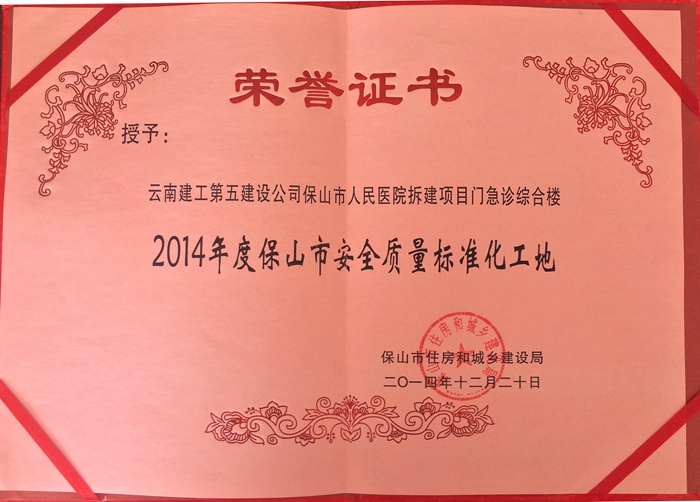技術(shù)支持: 方森科技 3月27日,保山市住建局組織召開全市建筑業(yè)管理暨工程質(zhì)量安全監(jiān)管工作會(huì)議,對(duì)2014年度在工程質(zhì)量安全監(jiān)管工作上取得優(yōu)異成績的單位進(jìn)行表彰。其中,由公司第四直管項(xiàng)目部施工的保山市人民醫(yī)院遷建項(xiàng)目被授予“2014年度保山市安全質(zhì)量標(biāo)準(zhǔn)化工地”榮譽(yù)稱號(hào)。
