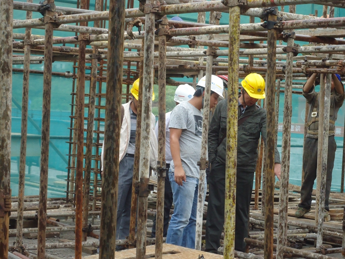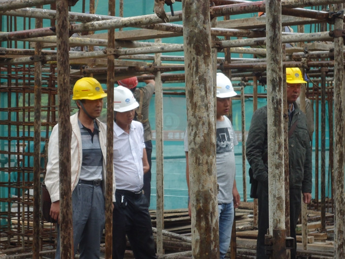 焦倫杰一行首先對生化膜池進行實地觀查,詳細了解膜池及設備區(qū)高支模的相關技術和操作細節(jié)后,指出施工現(xiàn)場存在的安全問題,并要求項目部及時進行整改,針對雨季施工面臨的問題給出了解決的意見和建議。