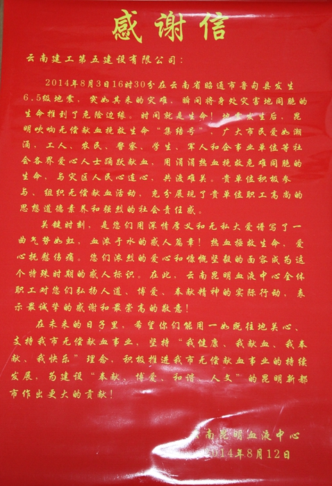 “關(guān)鍵時(shí)刻,是您們用深情厚誼和無私大愛譜寫了一曲氣勢如虹,血濃于水的感人篇章……”8月19日,云南昆明血液中心向公司贈送感謝信。