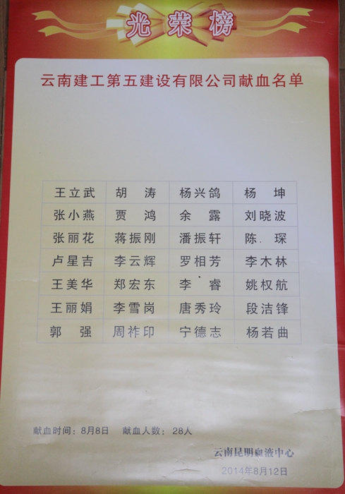 8月8日下午,公司組織33名志愿者到云南昆明血液中心獻(xiàn)血,總獻(xiàn)血量達(dá)7800ml,并且還有不少職工都自發(fā)的去獻(xiàn)血,助人為樂。
