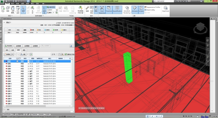 在集團(tuán)組建了BIM工作站后,公司技術(shù)中心按照要求于2014年4月正式成立了BIM工作室,目前建模人員2人(土建專業(yè)1人,水電專業(yè)1人)。公司根據(jù)BIM技術(shù)運(yùn)用的特點(diǎn)和新開項(xiàng)目實(shí)際,選取保山醫(yī)院門診樓項(xiàng)目作為首個(gè)BIM技術(shù)研究的試點(diǎn)工程,并于2014年5月1日開始模型繪制,至同年6月30日完成模型初稿繪制,耗時(shí)2月,分專業(yè)、分系統(tǒng)完成工程信息模型的建立,在模型碰撞檢查中發(fā)現(xiàn)43946個(gè)碰撞,其中真實(shí)碰撞點(diǎn)25000余個(gè)。