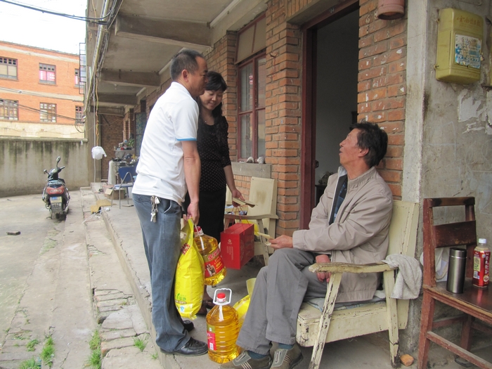 首先慰問的是直管部退休老職工李學智,今年73歲,一直單身,膝下無子女,獨自生活在宿舍區(qū),一直以來直管部領導都特別關心他的生活起居,除節(jié)假日以外都會抽時間去看望他,我們?nèi)サ剿視r,他剛好午睡完,看見我手里拿著相機,他沒接我們遞給他的慰問品,反而一本正經(jīng)地跟我說:“等一下,我穿好衣服戴上帽子再照可以嗎?”說著急急忙忙去穿外衣,帶上帽子才來接收,我們幾個都被他逗樂了,在帶給他領導的問候和了解了他最近的生活和身體情況后,他說:“真的很感謝啊……”之后的話語由于方言和語速沒聽太清,但是我發(fā)現(xiàn)他的眼眶噙滿了淚水。其實我們很清楚老人為什么會這樣的舉動,今年7月14日凌晨2點,老人疼痛難耐,被直管部保安發(fā)現(xiàn),負責保衛(wèi)后勤的李本紅及時將老人送到西山區(qū)第一人民醫(yī)院,經(jīng)診斷老人患了急性胃穿孔,連夜手術保住了性命,手術全程以及之后的所有住院手續(xù)都是直管部負責陪護和辦理。