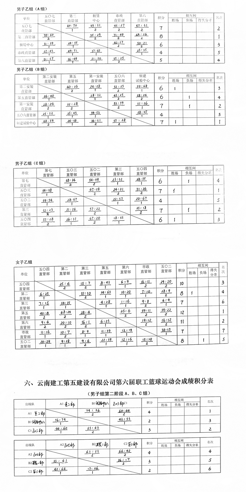 公司第六屆職工籃球運動會成績積分