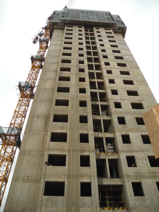 一進(jìn)入現(xiàn)場(chǎng),眼前的場(chǎng)景便讓大家耳目一新,同樣是進(jìn)行模板搭設(shè)工作,卻沒(méi)有頭頂上飛來(lái)飛去的塔吊,也沒(méi)有卸料平臺(tái)和卸料工人,原來(lái)是因?yàn)殇X合金模板拆裝方便,所有模板均通過(guò)樓板的孔洞傳遞,所以減少了塔吊的使用和安全隱患。在模板拆卸后的樓層里,平整的墻面、頂面,順直的陰陽(yáng)角更是讓各位參觀者眼前一亮。