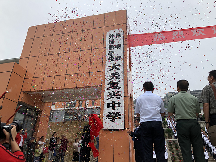 昆明市外國語學(xué)校(大關(guān)復(fù)興中學(xué))揭牌儀式在莊嚴(yán)肅穆大門隆重舉行,干凈平坦的道路、寬敞明亮的教學(xué)樓、整潔有序的宿舍樓、溫馨的教師周轉(zhuǎn)房以及飯菜飄香的食堂一一呈現(xiàn)在大關(guān)全體人民的眼中。