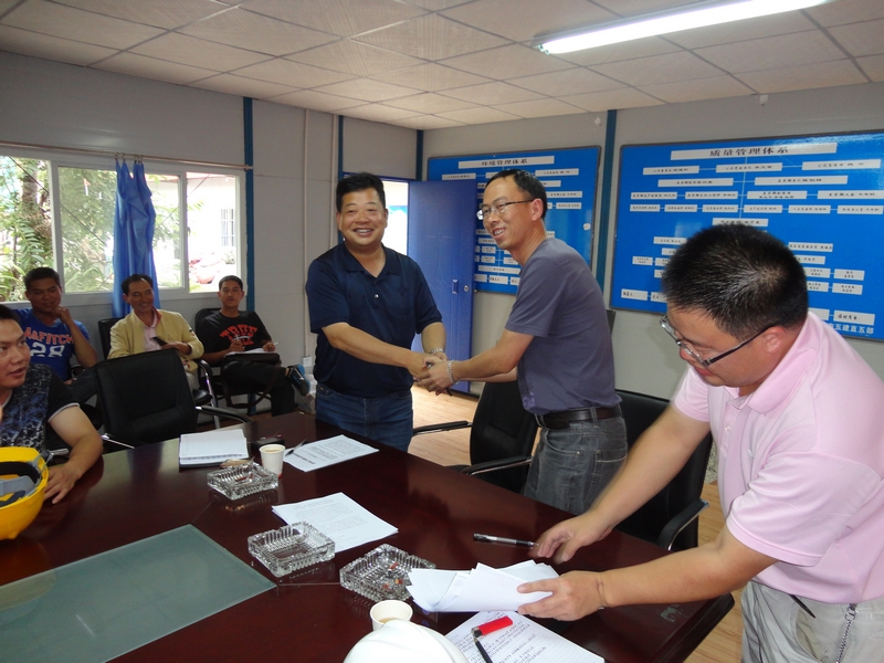 第五直管部經(jīng)理李興奎(左)與各項(xiàng)目部項(xiàng)目經(jīng)理、相關(guān)部門負(fù)責(zé)人簽訂責(zé)任狀(一)