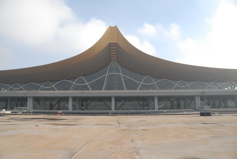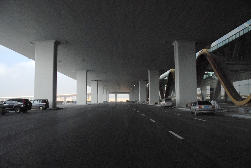圖為新機(jī)場(chǎng)航站樓及樓前高架橋全景