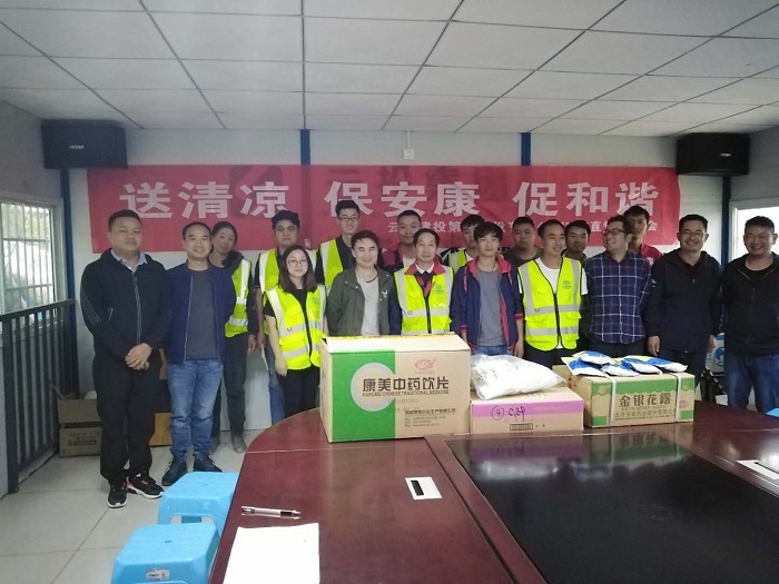 六月,畢鵬分別到2018年五華區(qū)C級(jí)不安全校舍重建項(xiàng)目、鎮(zhèn)雄縣第二人民醫(yī)院項(xiàng)目、大關(guān)縣翠華鎮(zhèn)中學(xué)項(xiàng)目進(jìn)行“送清涼”慰問(wèn),為項(xiàng)目一線職工們送去了菊花茶、十滴水、金銀花露、驅(qū)蚊藥水等物品。炎熱的夏季,頭頂烈日,穿梭于鋼筋叢林之中,一旦出現(xiàn)頭暈等中暑癥狀,一小瓶十滴水就會(huì)及時(shí)緩解癥狀;辛苦一天,晚上回到寢室,泡上一杯菊花茶,可緩解一天的疲勞;夜深了,點(diǎn)上一圈蚊香,或噴上一點(diǎn)驅(qū)蚊液,整夜好眠。