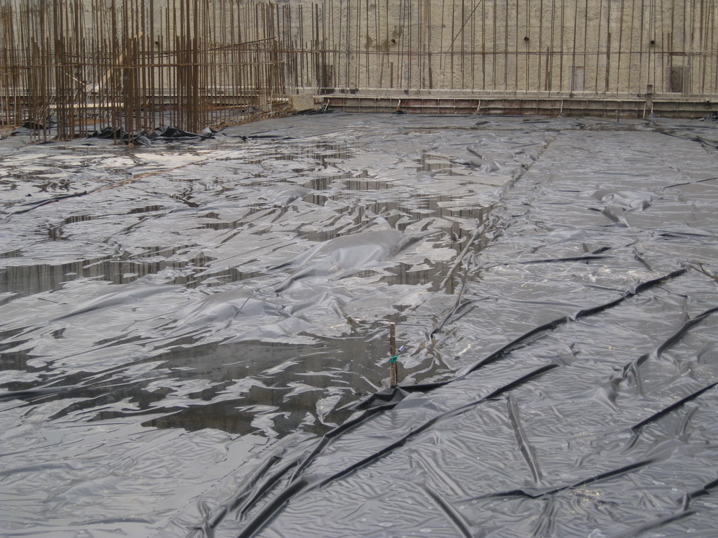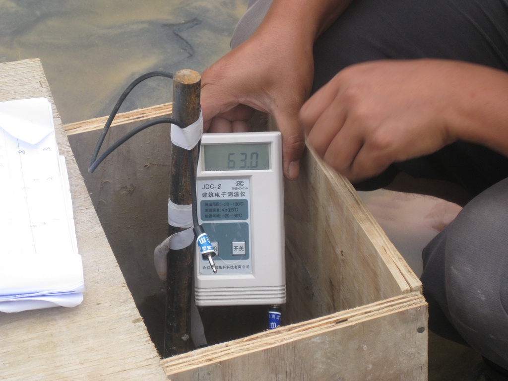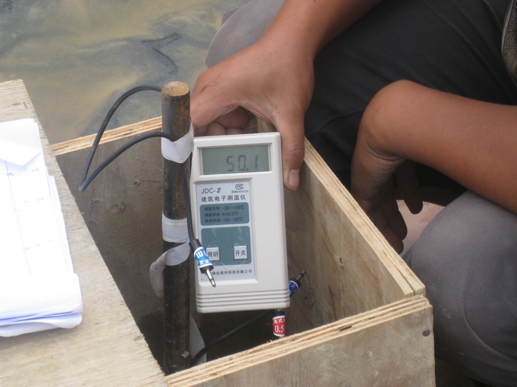 根據(jù)我公司大體積混凝土施工的成功經(jīng)驗(yàn),在澆灌混凝土之前編制了基礎(chǔ)大體積混凝土施工方案,采取優(yōu)化配合比設(shè)計、設(shè)置澆筑分倉縫,合理確定澆灌順序,保證筏板不出現(xiàn)冷縫,采用蓄水保溫養(yǎng)護(hù)法,并根據(jù)規(guī)范要求布置了7個測溫點(diǎn)。