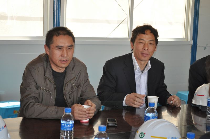 圖為開工當(dāng)天公司總經(jīng)理魏華(左)為項(xiàng)目部作指示、提要求