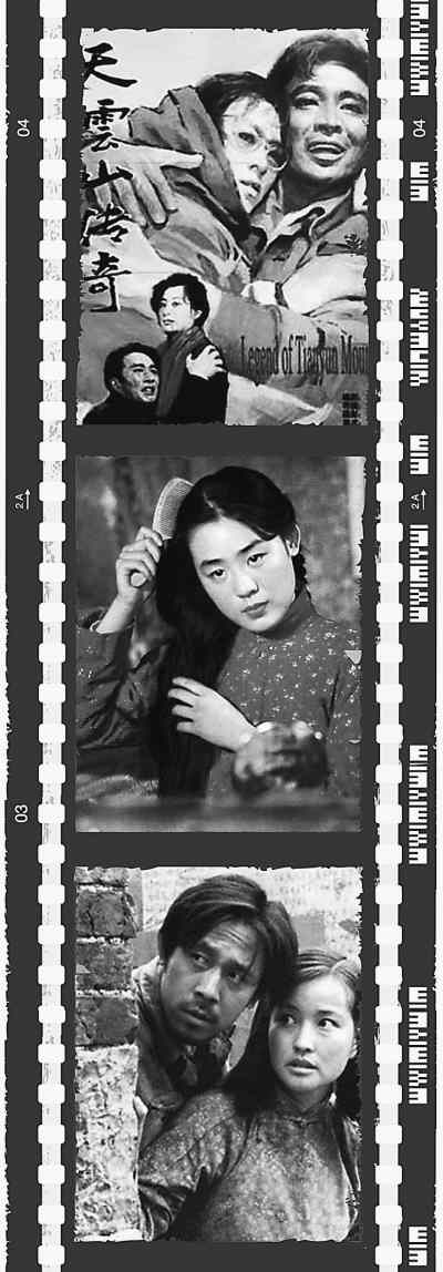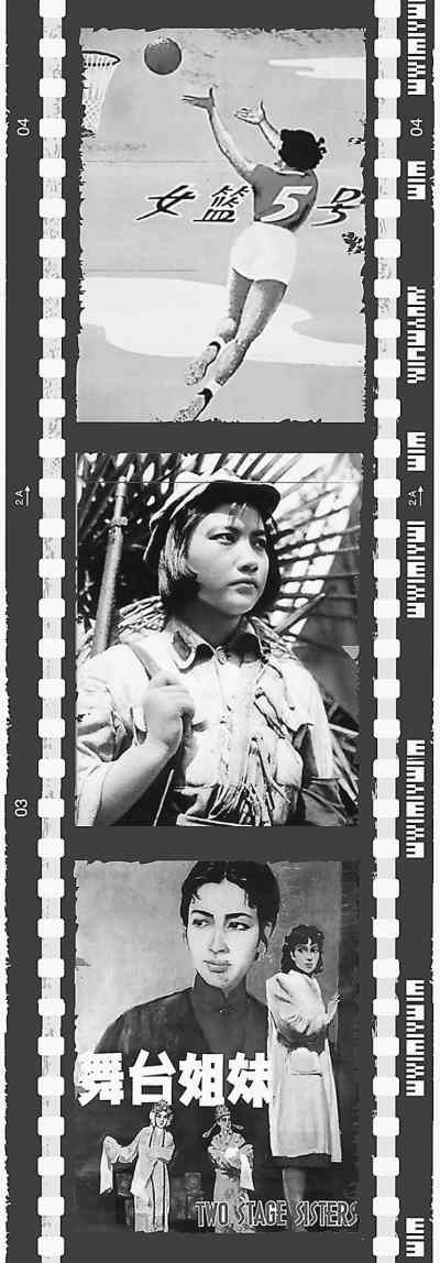 圖從上到下依次為《女籃五號(hào)》、《紅色娘子軍》、《舞臺(tái)姐妹》的電影劇照或電影海報(bào)。 |