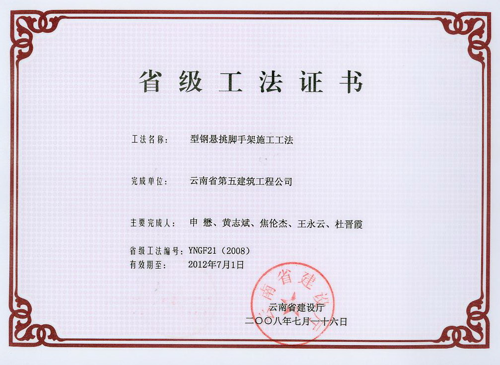 云南五建編制的省級工法——型鋼懸挑腳手架施工工法