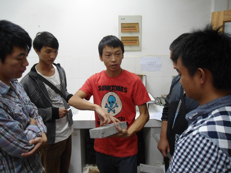 圖為試驗(yàn)計(jì)量中心工作人員為學(xué)員講解混凝土實(shí)心磚的檢測(cè)過程