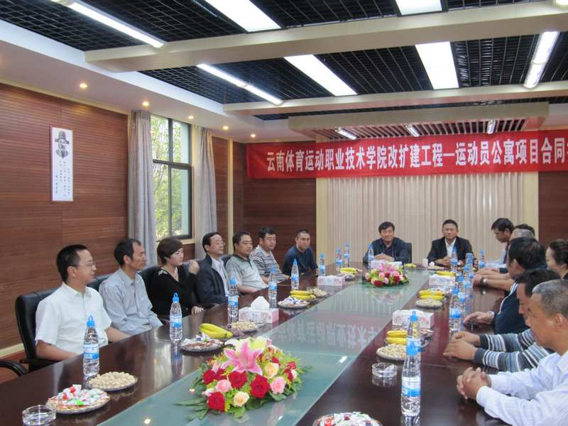 該工程的簽訂得到了云南省體育局和公司領(lǐng)導(dǎo)的重視,合同簽訂當(dāng)天,省體育局局長沈俊鑌、建管中心主任曾延成、學(xué)院黨委書記兼院長李錫云及院領(lǐng)導(dǎo)班子,公司董事長楊福和、總經(jīng)理魏華、副總經(jīng)理張迎躍、經(jīng)營部負責(zé)人及直管部領(lǐng)導(dǎo)班子全部到場參加。沈俊鑌局長在簽訂儀式上表示,與五公司合作的第一個項目——云南體育運動職業(yè)技術(shù)學(xué)院教學(xué)大樓項目,得到了省體和學(xué)院的一致好評,所以有了第二次的合作,同時他表示,希望與五公司建立長期合作關(guān)系。楊福和也表示,無論項目大小,五公司都會以精品工程的要求去完成,一如既往地交上滿意答卷。
