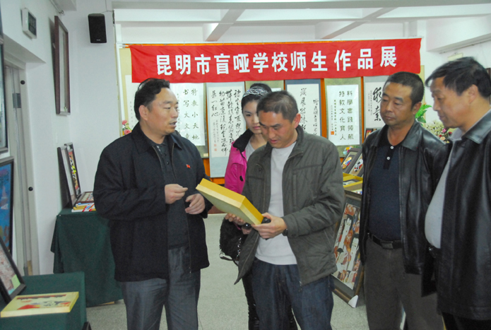 魏華(中)一行在昆明市盲啞學(xué)校校長(zhǎng)楊志成的陪同下參觀學(xué)校師生作品