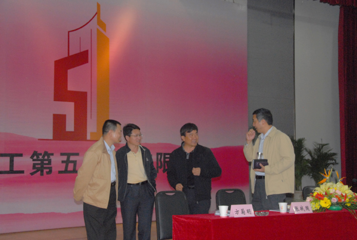 集團董事長、黨委書記納杰(右),黨委副書記、紀委書記張戰(zhàn)國(左)與公司董事長、黨委書記楊福和(右二),總經(jīng)理方菊明(左二)在課間休息時交談