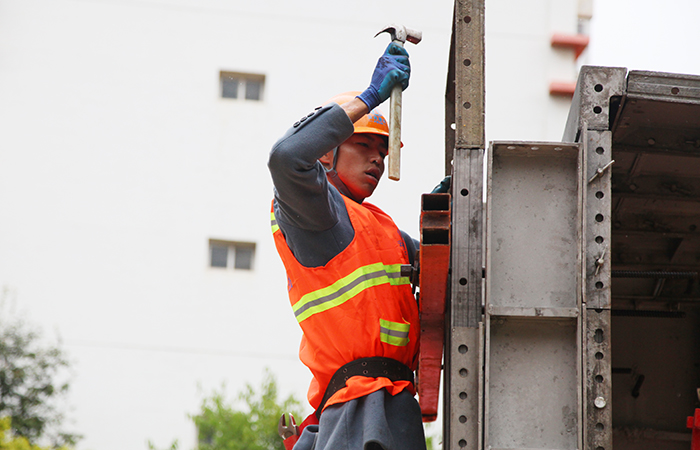 10點20分左右,天空雨水依然連綿,實操比賽正式開始,五組參賽選手同時在實操區(qū)域按照圖紙安裝鋁模,現(xiàn)場撐模板、插螺桿、旋螺母的聲音相互摩擦,叮叮當(dāng)當(dāng)響個不停,瞬間掀起比賽的熱烈氛圍。有小組分工明確,操作熟練,進度顯而易見,有小組注重細節(jié),安裝井然有序,模板牢固平穩(wěn)。在一小時的規(guī)定時間結(jié)束后,裁判人員對安裝完成的模板的質(zhì)量、指導(dǎo)安裝、文明施工等方面進行綜合評分,對是否按配模圖紙進行還原模板、模板垂直、平整度等進行嚴格打分。隨后,所有參賽選手按要求拆除模板并堆碼材料回原位。
