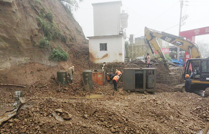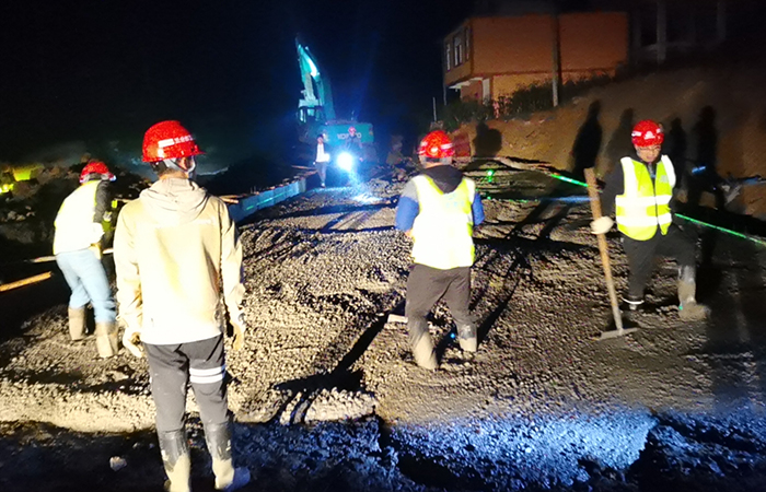 巧家三水廠項目“雙節(jié)”期間因巧家突降數(shù)十年未遇大暴雨,新龍洞及伍家溝進場道路因塌方而受阻。項目班子團隊快速反應(yīng),將主要管理人員分為兩支隊伍,一支隊伍指揮夜以繼日搶修擋墻并快速清理泥石流;另一支隊伍緊鑼密鼓進行隧道施工。經(jīng)過幾天日夜奮戰(zhàn),項目完成道路清通的同時順利完成隧道開挖支護70米。