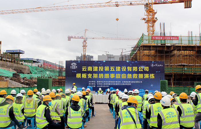 為了進一步完善一線項目部的應(yīng)急機制,檢查應(yīng)對突發(fā)事件所需應(yīng)急隊伍、物資、裝備、技術(shù)等方面的準(zhǔn)備情況,檢驗和完善應(yīng)急預(yù)案的實用性和可操作性,提高一線項目人員的應(yīng)急處置能力,公司于9月29日早上9時在五華醫(yī)院項目部組織開展第三季度模板支架坍塌事故應(yīng)急演練。