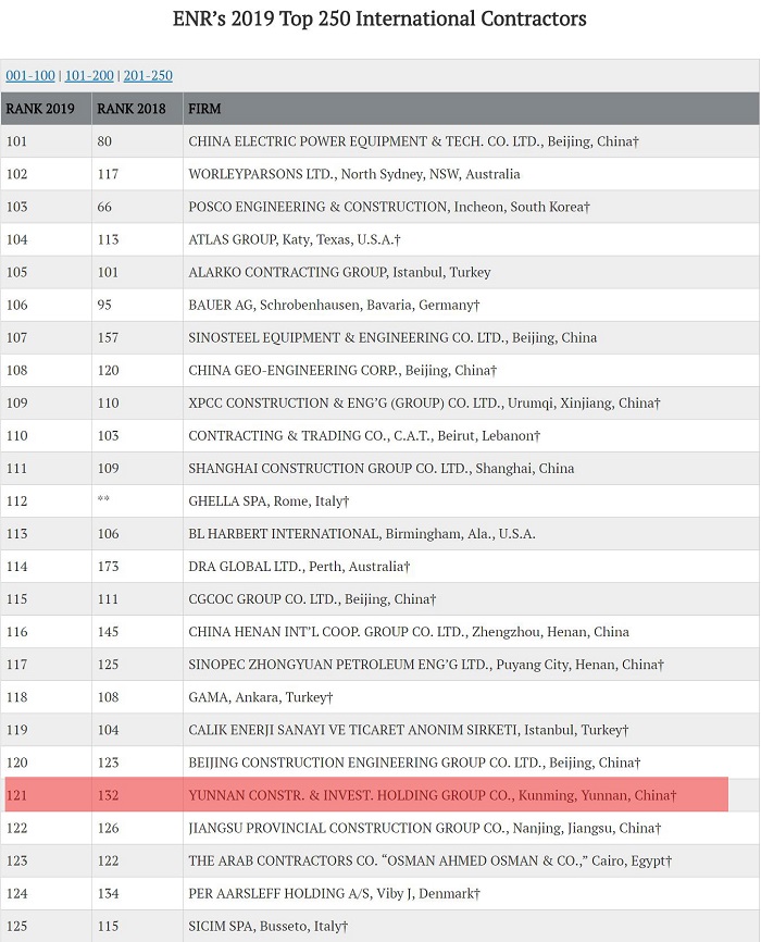 近日,2019年度美國(guó)《工程新聞紀(jì)錄(ENR)》“全球最大250家國(guó)際承包商”榜單發(fā)布,集團(tuán)再次入圍,名列121位,比上年提升11位,位列進(jìn)入榜單的中國(guó)企業(yè)第35名。至此,集團(tuán)已連續(xù)10年入選ENR國(guó)際承包商250強(qiáng)企業(yè)。 近年來(lái),集團(tuán)積極響應(yīng)“一帶一路”倡議,積極投身云南省建設(shè)面向南亞東南亞輻射中心戰(zhàn)略布局,“勤修內(nèi)功”全面打造包括海外投資和新興產(chǎn)業(yè)投資在內(nèi)的“…